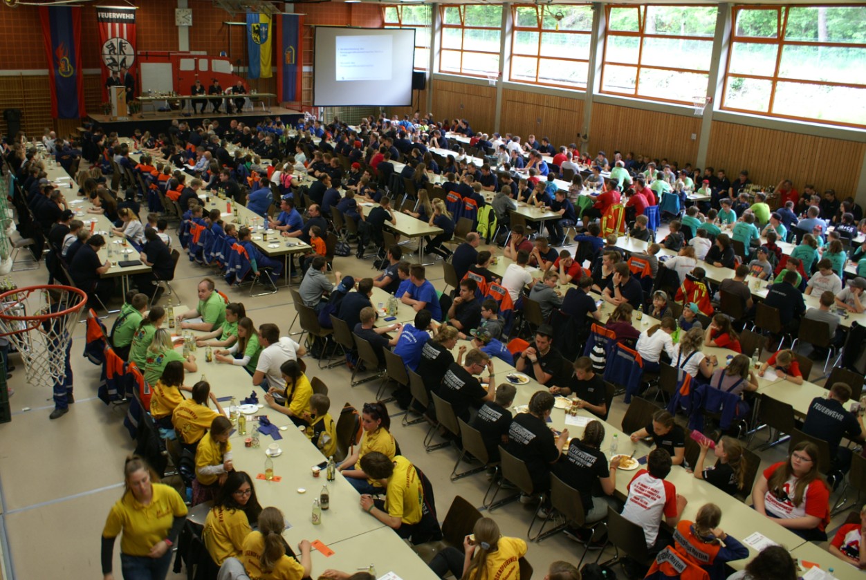 Nach dem Mittagessen in der prallgefüllten Halle, eröffnete Frank Gommeringer nach der Delegiertenversammlung der Kreisjugendfeuerwehr den kleinen Festakt. Er gab einen Einblick in die Geschichte der Jugendfeuerwehr und zeigte auf, wie bedeutsam Jugendarbeit ist. Er bedankte sich insbesondere bei den vielen Jugendleitern und Jugendlichen, die zum Aufbau und zum Fortbestand unserer Jugendfeuerwehr beigetragen haben. Weitere Grußworte gab es von Gesamtkommandant Ralf Martin und Bürgermeister Fritschi.