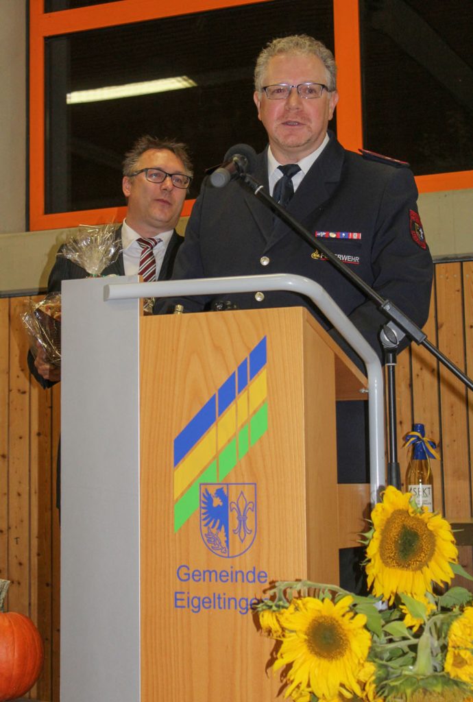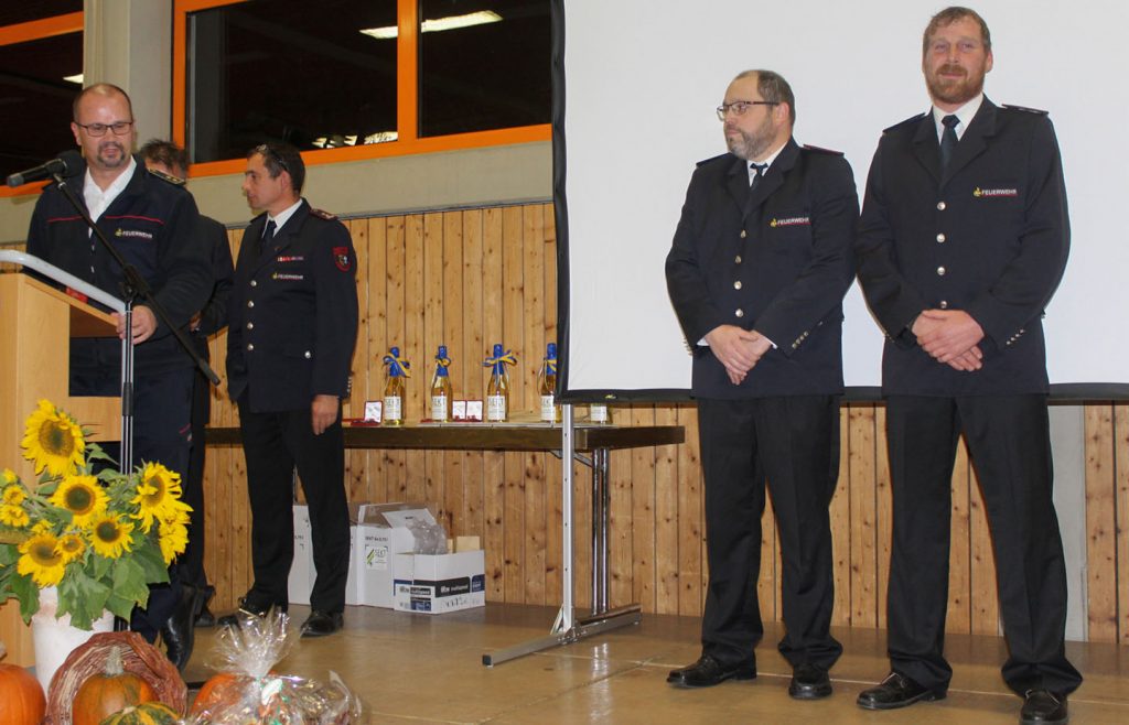 Nach lobenden Worten des Bürgermeisters Alois Fritschi für die leistungsstarke Feuerwehr und die gute Zusammenarbeit mit der Verwaltung verlieh er überraschend eine besondere Auszeichnung der Gemeinde: Mathias Martin hatte sich als Kommandant besonders beim Zusammenwachsen der Ortsteilfeuerwehren sowie rund um die Jugendabteilung und die Gesamtwehr verdient gemacht.