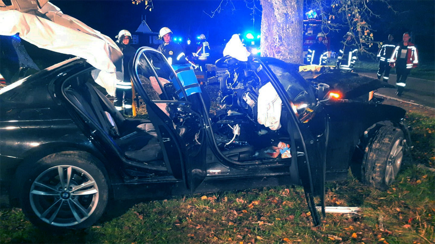 bei einem Verkehrsunfall wurden in der Nacht von Freitag auf Samstag, 26. Oktober die Feuerwehr Abteilungen Eigeltingen, Honstetten und Reute alarmiert. Wegen noch ungeklärter Ursache war ein BMW-Fahrer neben der Verbindungsstraße zwischen Reute und Honstetten mit einem Baum kollidiert.