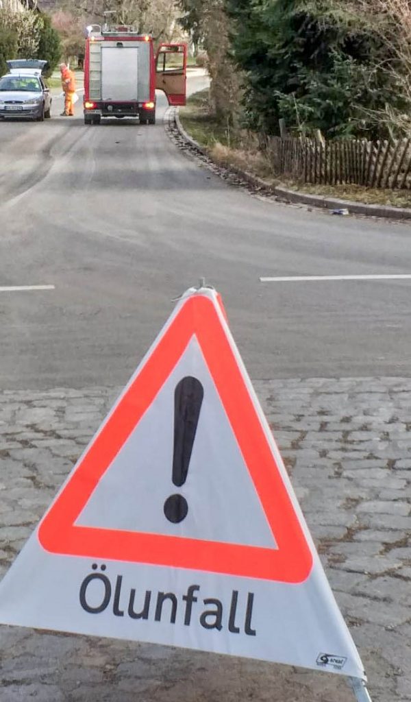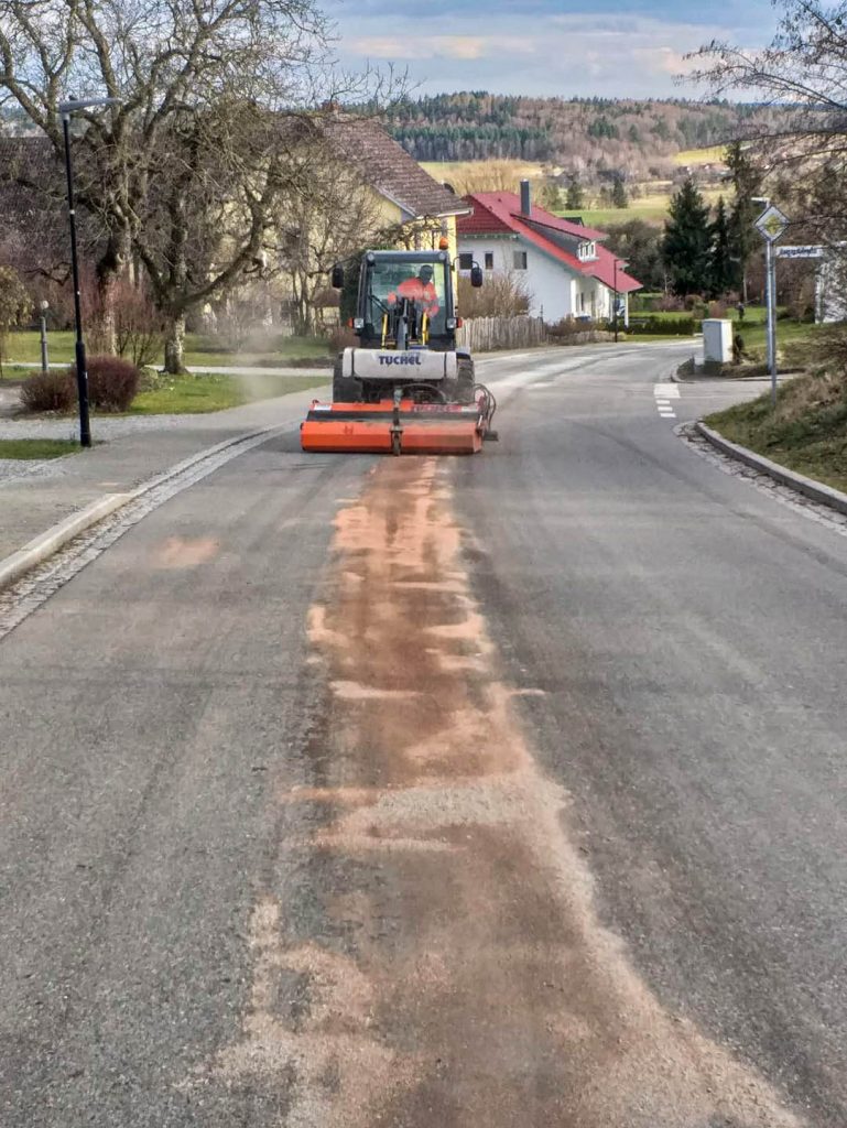 Der Einsatz der 8 Männer dauerte 2 Stunden, bis die Straße wieder gefahrlos befahrbar war. Hier unterstützte auch ein Feuerwehrangehöriger mit seiner Kehrmaschine.
