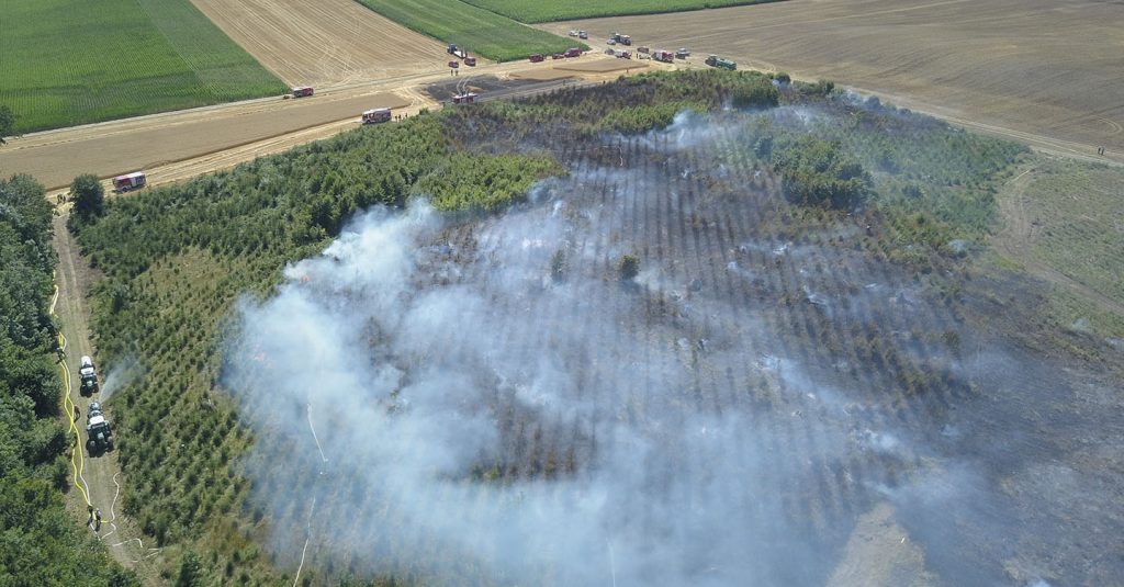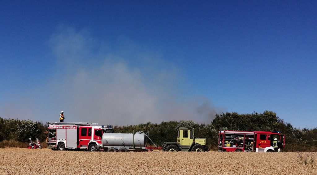 wurde die Feuerwehr Eigeltingen zu einem Flächenbrand beim Stockacherhölzle in der Nähe von Orsingen alarmiert. Ausgehend von einem Weizenfeld hatte das Feuer auf ein Waldstück übergegriffen und letztlich die Vegetation auf einer circa 5 Hektar großen Fläche zerstört. Laut Aussagen der Polizei hatte beim Arbeiten mit einem Mähdrescher abgeerntetes Stroh Feuer gefangen. Der Schaden wird auf 50.000 Euro beziffert. Durch das schnelle Eingreifen der Feuerwehren aus Eigeltingen und Ortsteilen, Orsingen-Nenzingen, Steißlingen und Stockach mit Führungsgruppe sowie des Tanklöschfahrzeuges aus Singen konnte jedoch Schlimmeres verhindert werden.