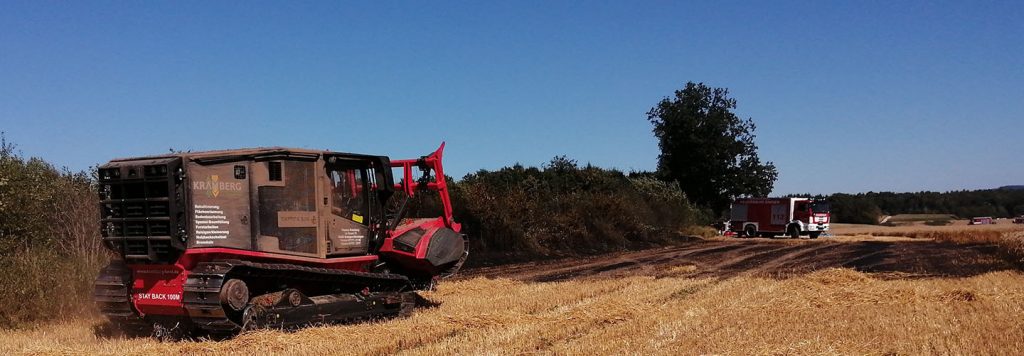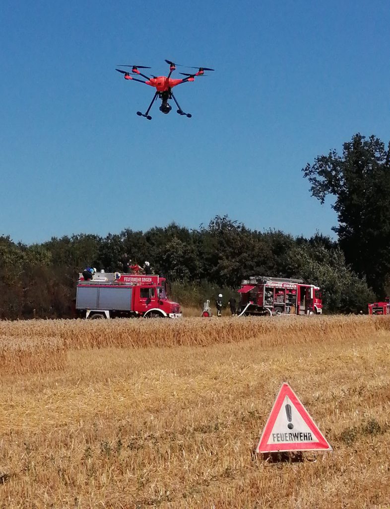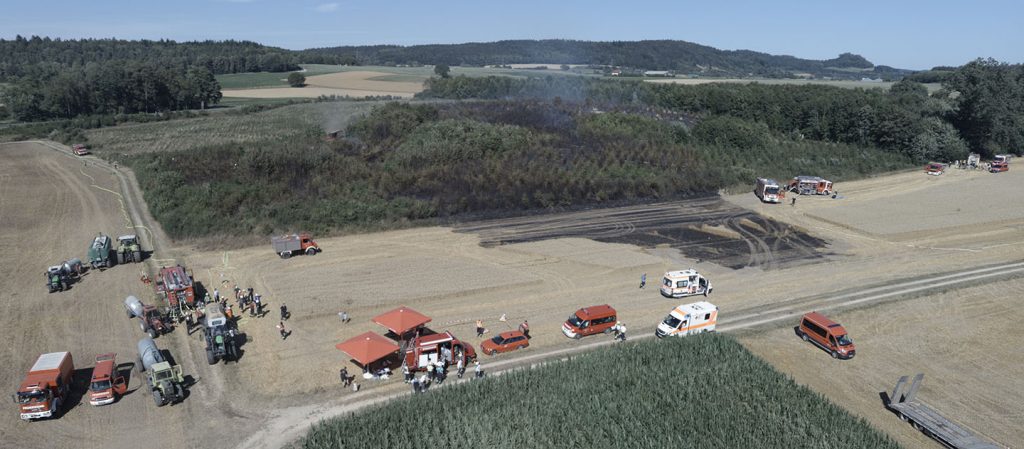 Ihren ersten Einsatz hatte hier die Drohnengruppe der Feuerwehren aus dem Landkreis Konstanz. Mittels 2 Drohnen wurde die Lage im unwegsamen Gelände von oben gesichtet. Mit 13 Fahrzeugen und rund 80 Feuerwehrangehörigen unter der Führung des Eigeltinger Kommandanten Ralf Martin gelang es, den Brand um 17.15 Uhr unter Kontrolle zu bringen. Unterstützt wurde von den Landwirten mit ihren Fässern, die im Pendelverkehr Wasser zur Einsatzstelle transportierten. Zur direkten Wasserentnahme aus dem Krebsbach musste eine lange Schlauchleitung gelegt werden. Aufgrund der starken Rauchentwicklung mit Ascheflug wurde die angrenzende L194 zeitweise durch die Polizei gesperrt. Mehrere Stunden waren die Feuerwehrangehörigen in der Sommerhitze im anstrengenden Einsatz, so musste auch ein Feuerwehrmann wegen Dehydrierung vom Rettungsdienst versorgt werden. Bis zum Einbruch der Dunkelheit gab es noch etliche Glutnester zu löschen. Einen besseren Zugang verschaffte hier eine Forstfräse. Die Aufräumarbeiten an der Einsatzstelle und im Feuerwehrgerätehaus zogen sich noch bis fast 23 Uhr hin.