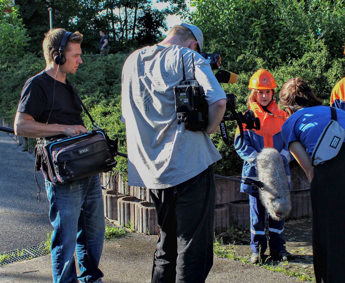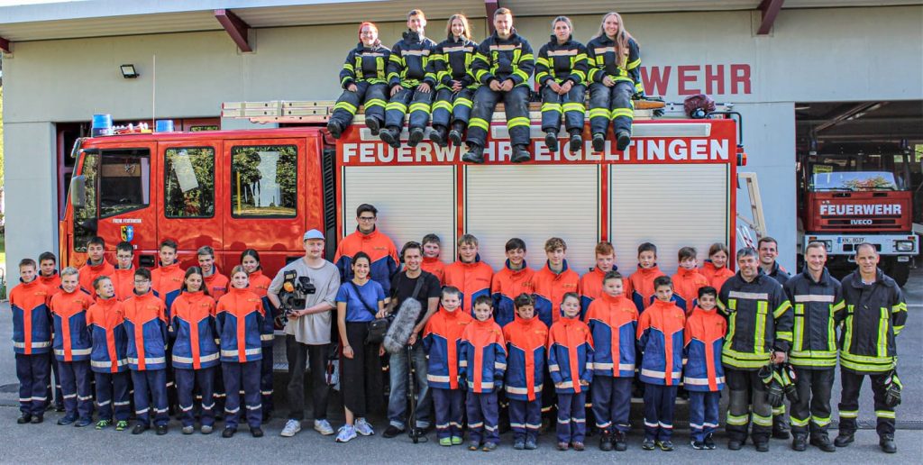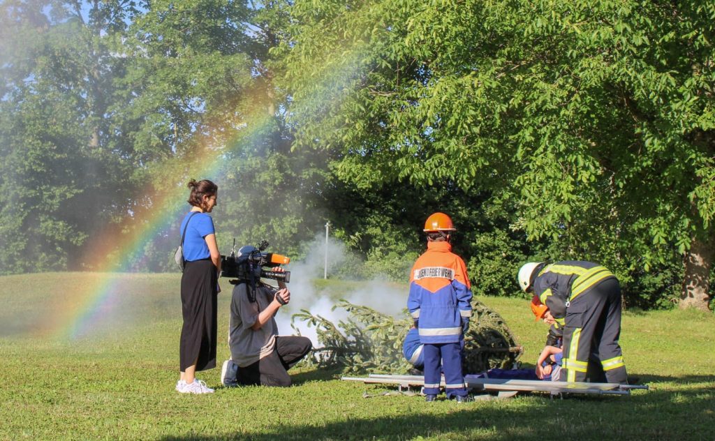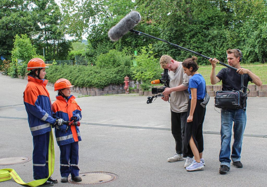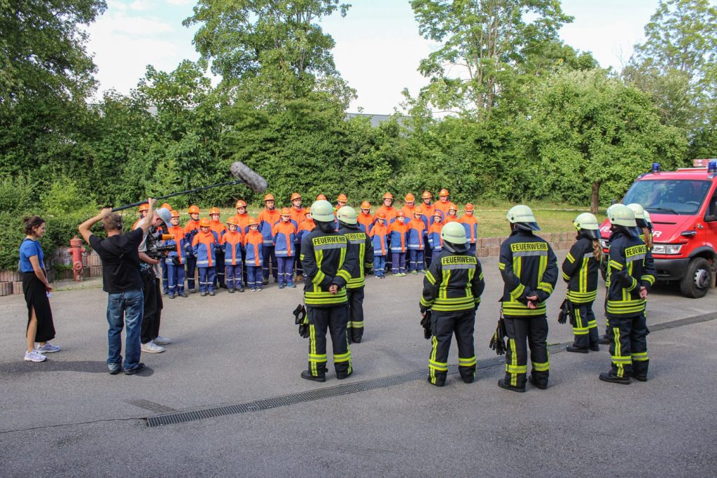 Eine Feuerwehrprobe der besonderen Art erlebten die Kinder und Jugendlichen am 3. Juli. In Eigeltingen war ein Fernsehteam von logo! zu Gast, einer Nachrichtensendung des ZDF für Kinder. Saadet, die Studiomoderatorin war mit Tontechniker Martin und Kameramann David gekommen, um einen Bericht zu „Mädchen in der Jugendfeuerwehr“ zu drehen. Hautnah erlebten die Teilnehmer wie Fernsehaufnahmen funktionieren und durften sich wie kleine Stars fühlen. Wie vom Team gewünscht haben sich die Jugendfeuerwehrler ganz normal verhalten und z.B. auch nicht direkt in die Kamera geschaut. Gleich zu Beginn gaben die 10jährige Ronja und die 12jährige Lilli ein Interview und sorgten für das Intro der Sendung. Lilli durfte dann im weiteren Verlauf auch eine Helmkamera tragen. Zum Einsatz kam auch eine Drohne. Spannend war es nicht nur für die Eigeltinger, die gefilmt und interviewt wurden. Sondern sicherlich auch für das TV-Team, die einen professionell durchgeführten Löschangriff mit Personenrettung sahen. Hier wirkten 5 Jungen in der üblichen 9-Gruppe zusammen mit 4 Mädchen. Auch Soraya (12 Jahre) und die 15jährige Ronja konnten im Interview bestätigen, dass Feuerwehr nur durch Teamarbeit funktioniert und besonders in Eigeltingen die Zusammenarbeit zwischen Mädchen und Jungen sehr gut, normal und gewohnt ist. Hierfür sorgen auch die 10 Betreuer unter Jugendwart Frank Gommeringer. Auch bei der Übung, die logo! filmte, wurde hier wie auch sonst üblich unterstützt, erklärt und geholfen. Wie immer lehrreich, aber auch mit Spiel, Spaß und Wasser. Was für den Feuerwehrnachwuchs wichtig ist und auch in den Interviews zum Ausdruck gebracht wurde. Ebenso mit dem Feuerwehrauto fahren gefällt sehr. Zum simulierten brennenden Baum wurde mit dem großen Löschgruppenfahrzeug angerückt, das gleiche Equipment wie die „Großen“ genutzt und auch ein kleiner Junge, der den Verletzten mimte, wurde mit der regulären Krankentrage gerettet. Vorurteile gegen Mädchen in der Feuerwehr haben die Kinder und Jugendlichen zwar schon gehört, aber in Eigeltingen gibt es diese in der Praxis nicht. Aktuell gibt es daher auch in den Einsatzabteilungen der Gesamtwehr 11 Frauen, die auch Gruppenführer, Maschinist und Atemschutzgeräteträger sind und von denen die meisten – auch aufgrund der sehr guten Jugendarbeit dort – aus der Jugendfeuerwehr kommen. Zu dem Kreis gehört aber auch eine Frau, die mit Mitte 40 erstmalig ihren Dienst begonnen hat. Feuerwehr ist daher für Mädchen und Jungen, Frauen und Männer fast jeden Alters möglich. Die Einsatzabteilungen freuen sich über erwachsene engagierte Eigeltinger, die dieses Ehrenamt lernen und helfen wollen. Und auch bei der Jugendfeuerwehr sind wieder Plätze frei. Proben für den jungen Nachwuchs ab 8 Jahren sind immer montags von 18:00 bis 19:15 Uhr. Hier gibt es Feuerwehrtechnik zum Erleben und Mitmachen. Und Spaß und Spiel, auch bei gemeinsamen Freizeitaktivitäten kommen nicht zu kurz.
