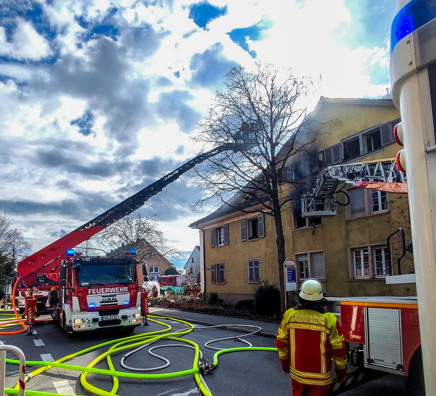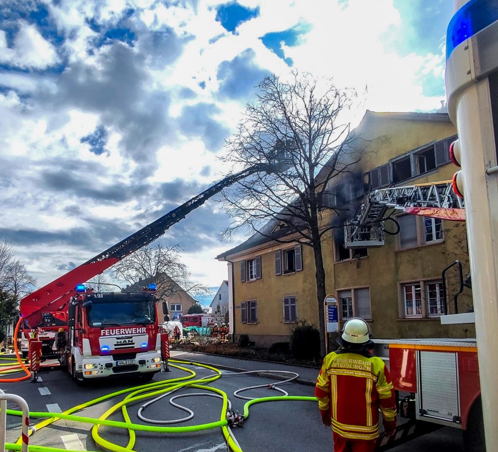 Am 11. März wurde gegen 14.30 Uhr ein Zimmer-Vollbrand mit drohendem Übergriff auf den Dachstuhl eines 3-geschossigen Wohnhauses in Steißlingen gemeldet.