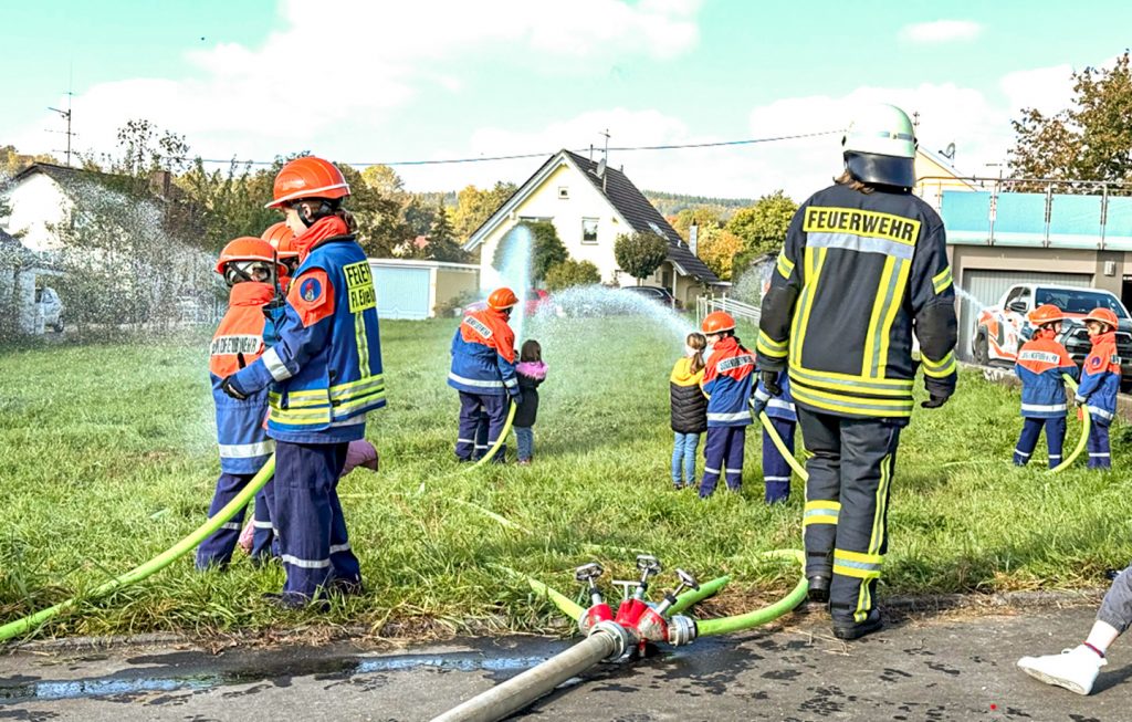 Mit vollbesetzten Feuerwehrfahrzeugten rückten die jungen Retter mit Blaulicht und Martinshorn an. Nachdem die zwei Verletzten gerettet und an unser HVO übergeben waren, hatten die Kinder und Jugendlichen an 9 C-Rohren den Brand schnell gelöscht. Mit voller Begeisterung und leuchtenden Augen arbeiteten alle konzentriert zusammen.