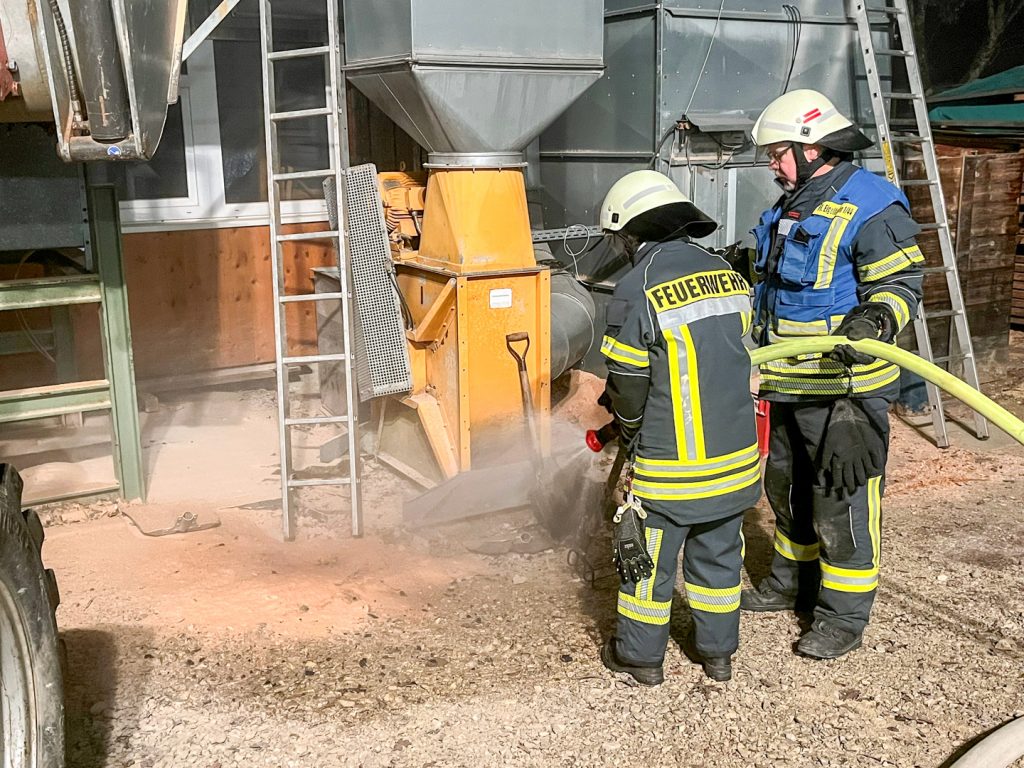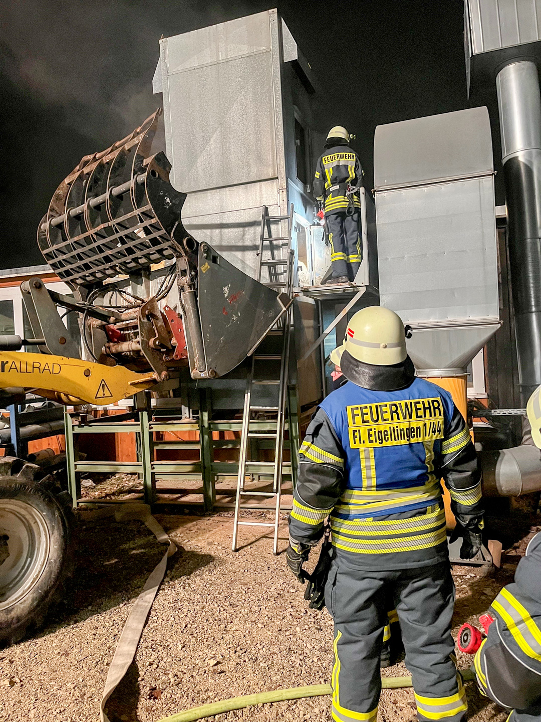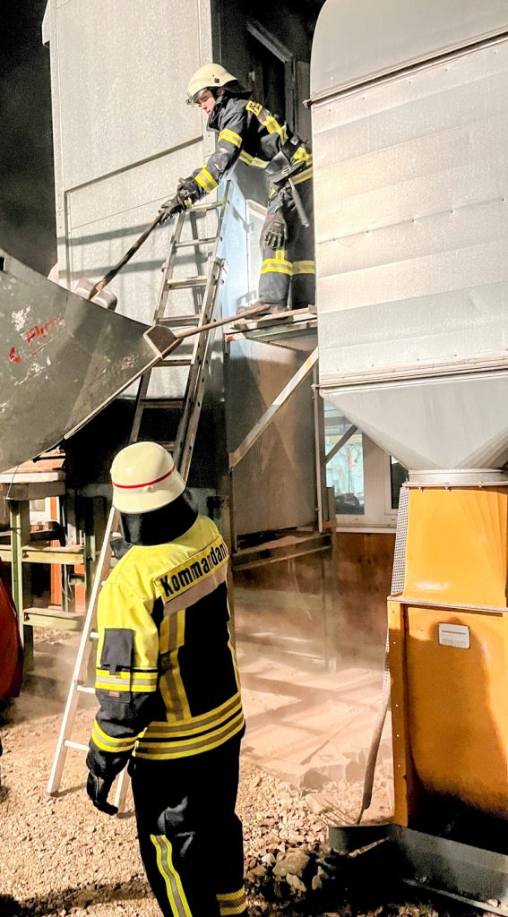 Bei der Kontrolle mit der Wärmebildkamera zeigte diese im Späneturm 75 Grad an. Der feine Holzstaub wurde abgetragen, Glutnester ausgeschaufelt und abgelöscht sowie im späteren Verlauf die Füllung abgelassen. Aufgrund der hohen Brandlast wurde zur Sicherheit eine komplette Wasserversorgung aufgebaut. Wie schwierig und umfangreich Löschmaßnahmen bei einer Ausbreitung bzw. bei offenen Flammen in einem solchen Betrieb sein können, zeigte die Jahreshauptübung der Abteilung Eigeltingen, die im letzten Jahr in diesem Objekt abgehalten wurde. Somit war die frühzeitige Alarmierung der Feuerwehr genau richtig und es konnte ein Brand verhindert werden.